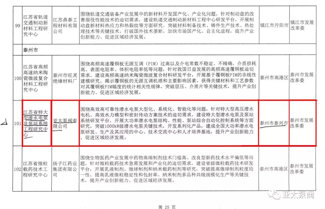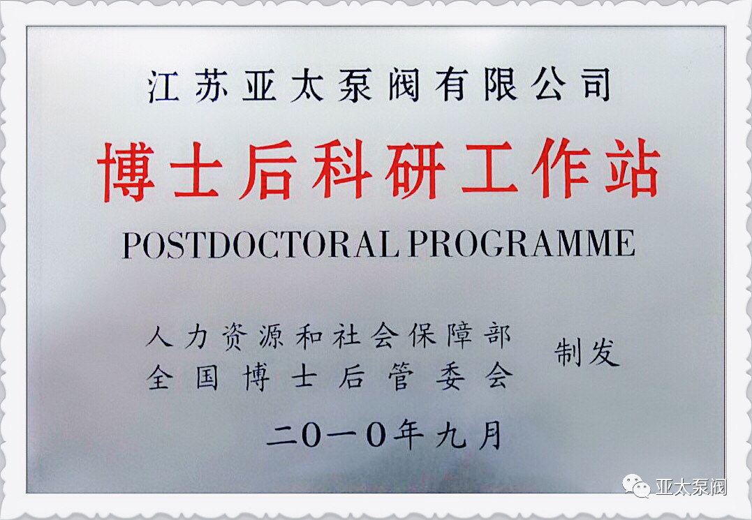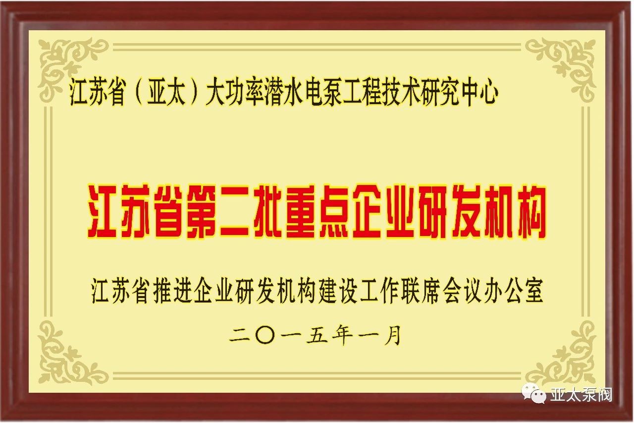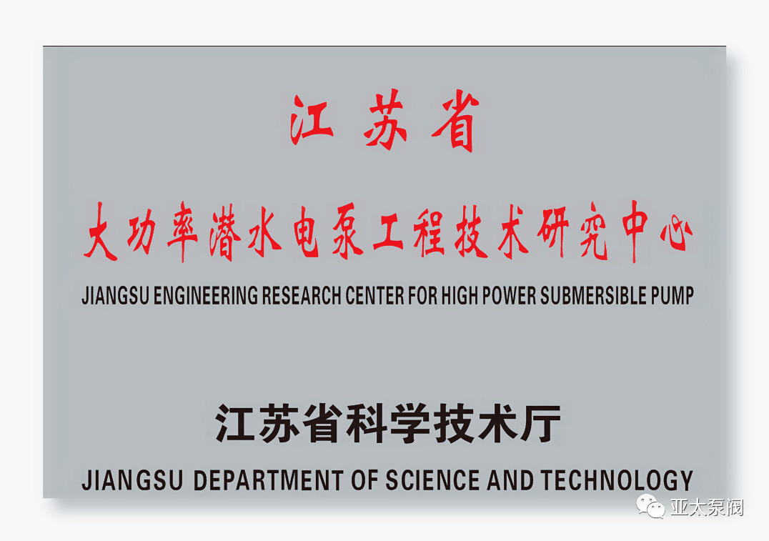 91视频成人泵閥有限公司是專業從事(shì)大功率潛水電泵及泵站係統(tǒng)研究的國家高新技術企業,企業先後(hòu)獲批國家博士後科研工作站、江蘇省(shěng)企業技(jì)術中 心、江蘇省大功(gōng)率潛(qián)水電泵工程技術研究(jiū)中心(xīn)、江蘇省研究(jiū)生工作站等省級平台,技術創新能力顯著增強,先後(hòu)獲得國家科技二等獎1項、省部級科技進步獎12項、承擔國家和省級(jí)研發項(xiàng)目11項(xiàng)、主持和參與製訂國家和行業(yè)標準8項。此次成功獲批省特大型潛水電泵及泵站係統工程研究中心(xīn),成為亞(yà)太泵閥第5個省級以上研(yán)發平台。