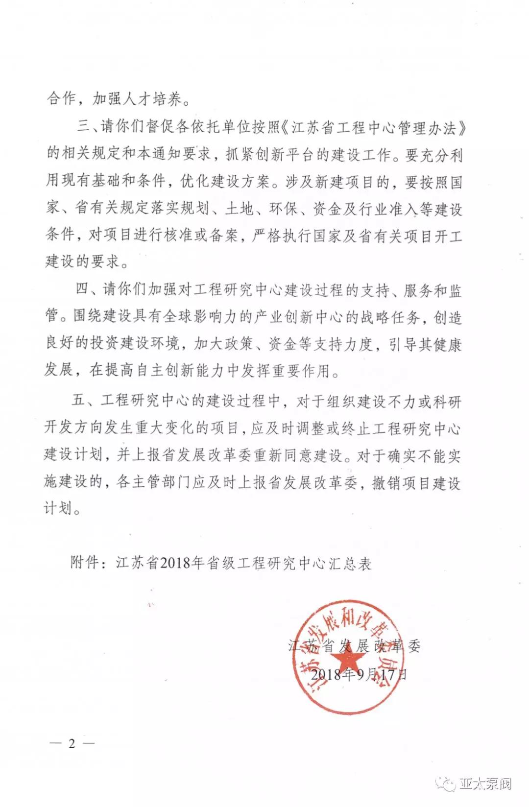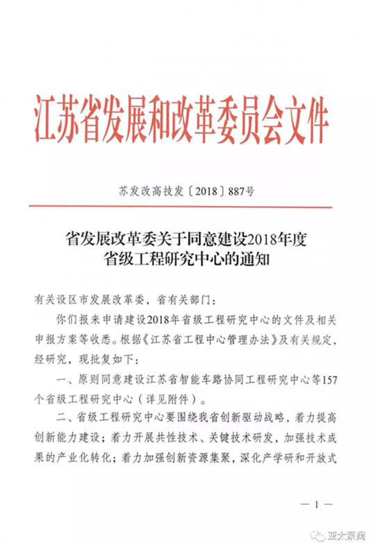 近日,省發改委正式發文,同意建設2018年度省級工程研究中心,亞(yà)太泵閥有限公司申報(bào)的省級創新平台江(jiāng)蘇省特大型潛水電泵及泵站係統工程(chéng)研究中心成功獲批,成(chéng)為我省水泵行業唯 一入選企業。